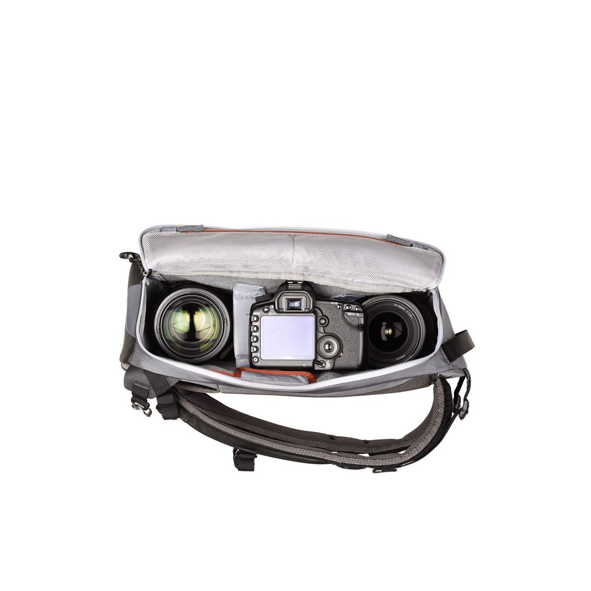 Phần ngăn chính được thiết kế đặc trưng để bạn có thể lấy máy ảnh nhanh chóng thông qua 1 ngăn bên hông. Ba lô còn có ngăn trước có thể đựng điện thoại và các phụ kiện khác.