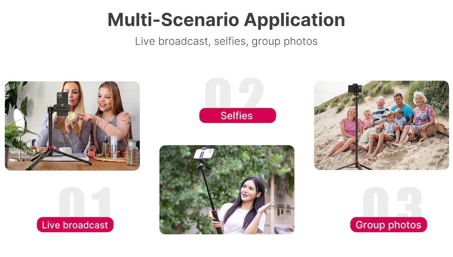 Đa năng: Sản phẩm có thể sử dụng ở nhiều chế độ khác nhau: chụp ảnh tự sướng cầm tay, đứng phát sóng trực tiếp (livestream), chụp ảnh nhóm hoặc quay video cá nhân.