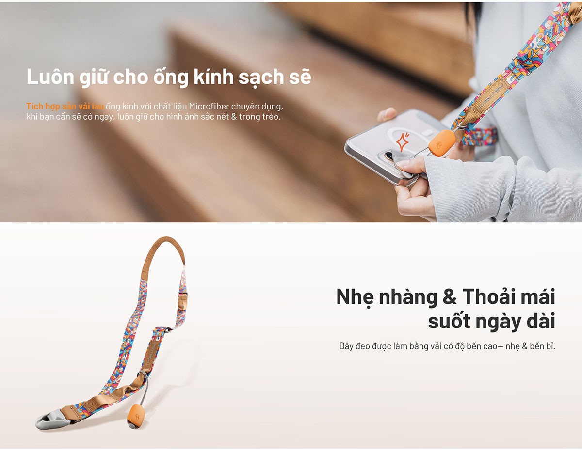 Khăn lau microfiber tích hợp: Khăn lau được tích hợp ngay trên dây, tiện lợi làm sạch ống kính nhanh chóng để đảm bảo mọi khung hình luôn sắc nét.