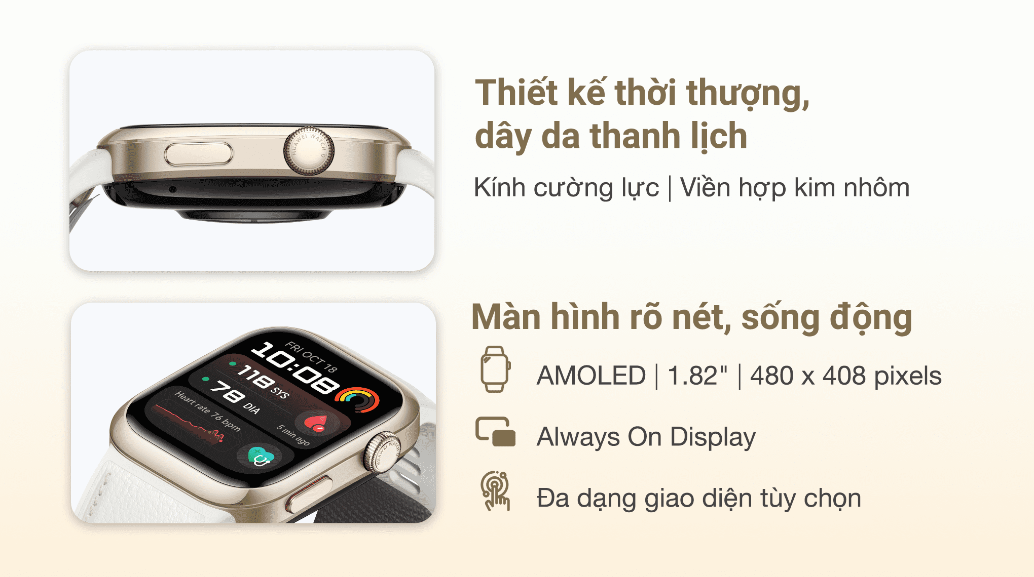 Màn hình luôn hiển thị (Always On Display) và kho mặt đồng hồ đa dạng giúp biến cổ tay thành một tác phẩm nghệ thuật sống động. Người dùng có thể tùy chỉnh giao diện mặt đồng hồ, thêm các widget yêu thích để thể hiện cá tính riêng.