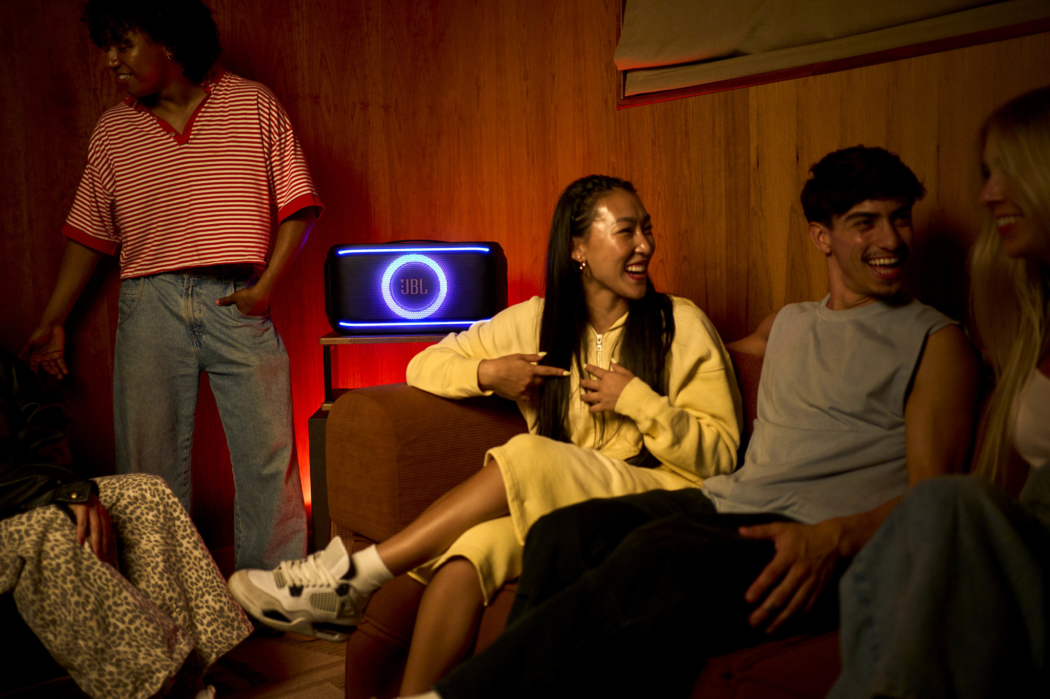 Ánh sáng Lightshow: Vòng đèn LED rực rỡ xung quanh loa trầm có thể tùy chỉnh và đồng bộ hóa với nhịp điệu bài hát, tạo nên một không gian tiệc tùng đầy màu sắc.