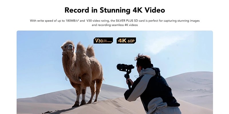 Với chuẩn Video Speed Class V30, thẻ được tối ưu hóa cho việc quay video độ phân giải cao 4K ở 60 khung hình/giây, đồng thời hỗ trợ chụp ảnh liên tiếp ở định dạng RAW và JPEG với tốc độ cao, không bỏ lỡ bất kỳ khoảnh khắc nào.